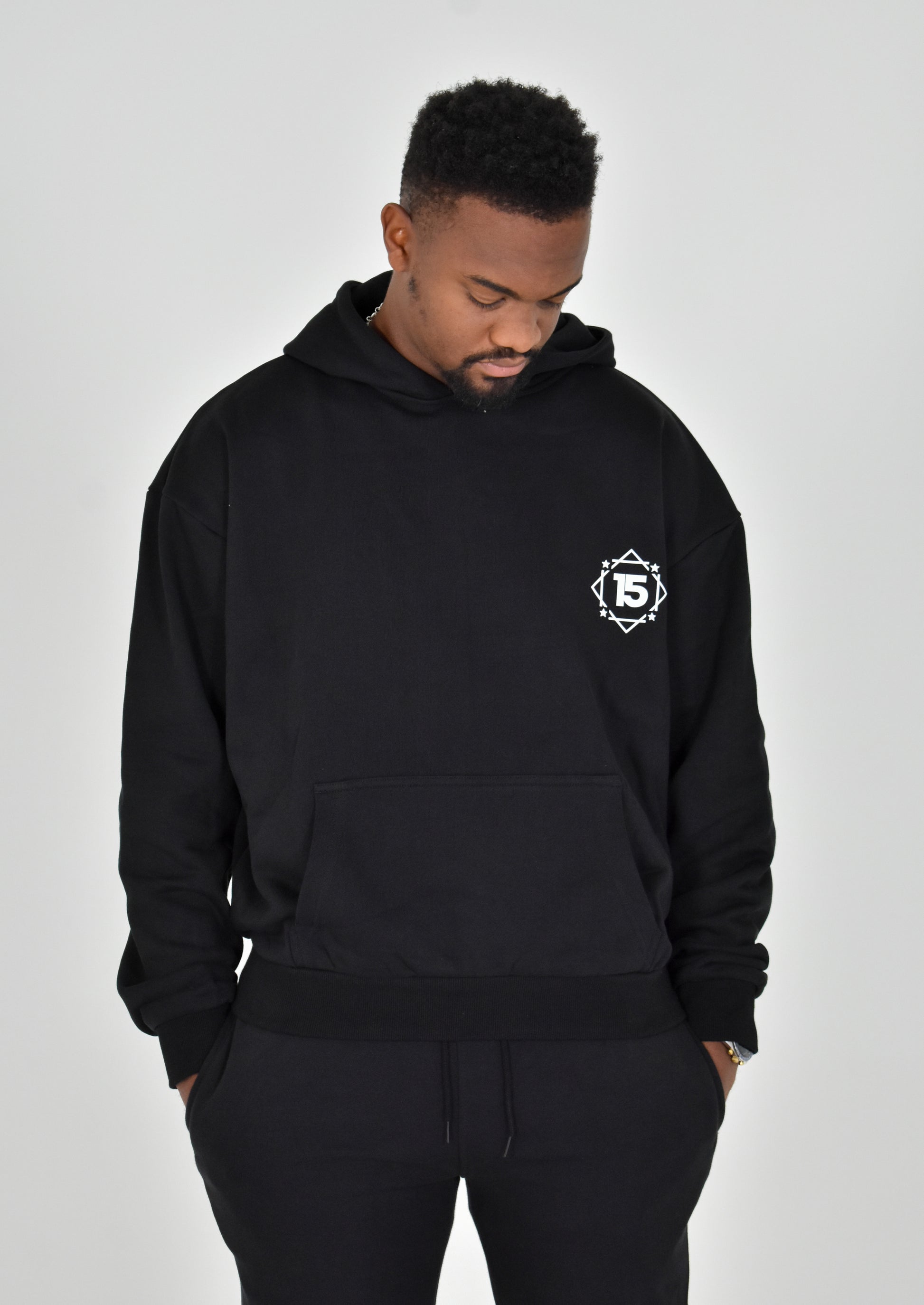 The F15teen Hoodie in Black is crafted from luxury heavyweight recycled cotton, with an oversized fit. The hoodie has ribbed hems and cuffs and is finished in 3D printing front and back.